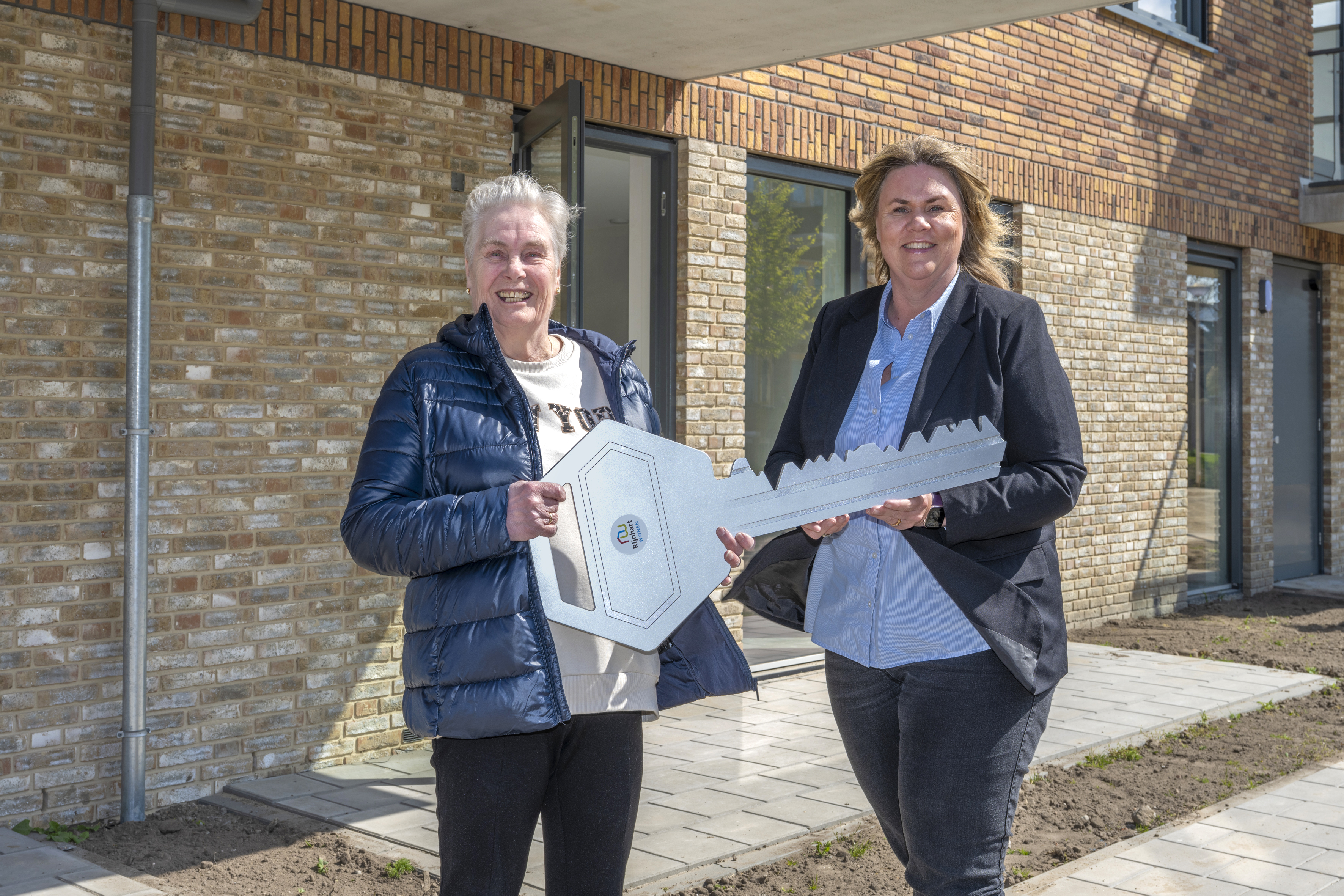 Onze Manager Wonen Janneke van ’t Oever overhandigde de sleutel aan mevrouw Verstraaten. "Ik heb met plezier aan de oude Pinksterbloem gewoond, en nu mag ik opnieuw beginnen in de nieuwbouw. Het huis is nieuw, maar de buurt voelt nog steeds als thuis."