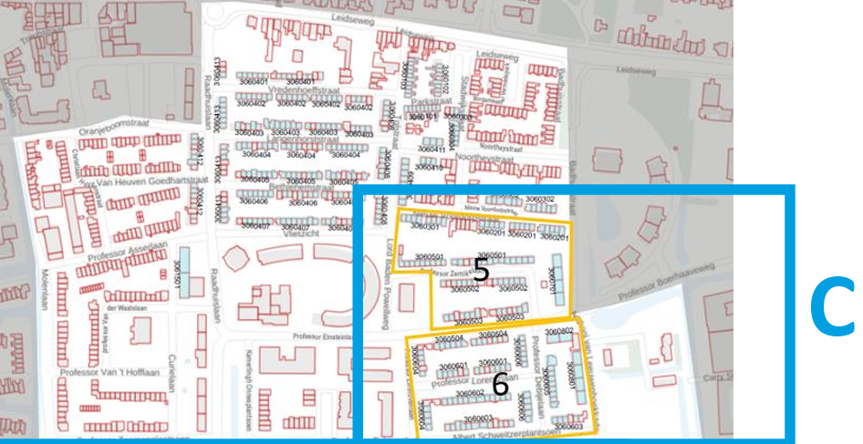 Deelgebied C is een deel van Vlietwijk. Het gaat om de volgende straten: Nieuw Voordorpstraat even nummers 6 t/m 60, Professor Zernikelaan, Lord Baden Powellweg, Professor Einsteinlaan, Professor Lorentzlaan, Albert Schweitzerplantsoen, Professor Einthovenlaan, Professor Debijelaan, Badhuisstraat, Anthoni van Leeuwenhoekkade.