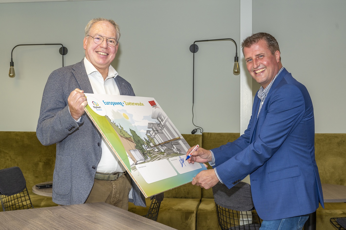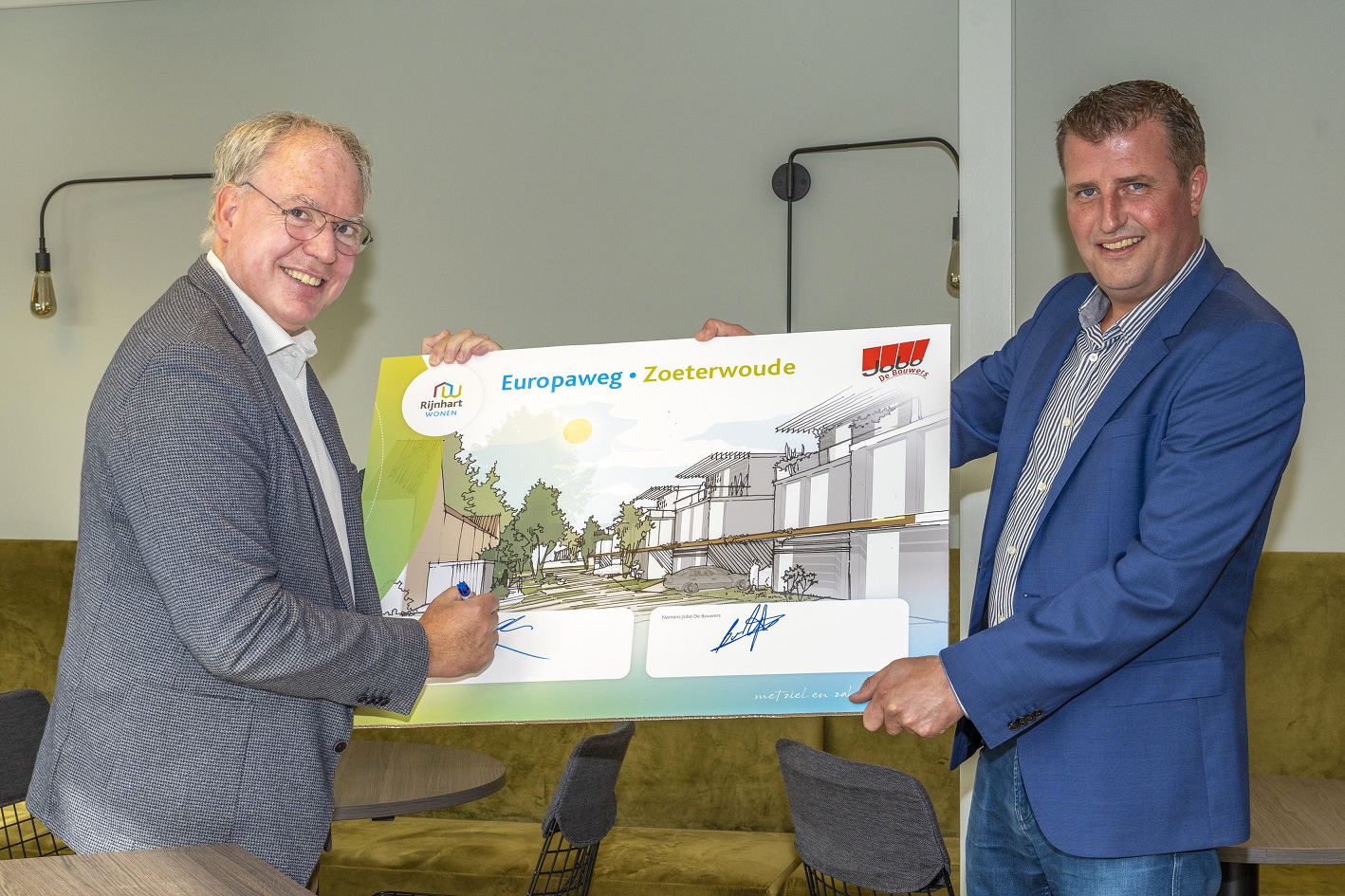 Afgelopen dinsdag ondertekenden vastgoedontwikkelaar Jobo Vastgoed B.V. en woningcorporatie Rijnhart Wonen een intentieovereenkomst voor nieuwbouw aan de Europaweg 2 in Zoeterwoude.
